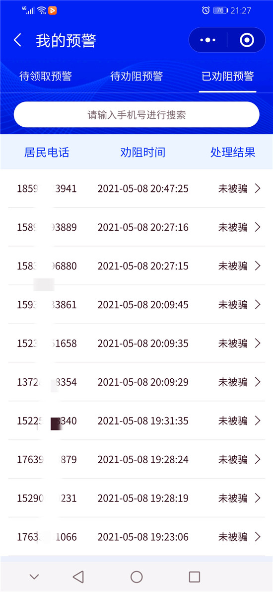 截至目前,洺南街道“金鐘罩”反詐預(yù)警系統(tǒng)注冊人數(shù)達(dá)21929人,受保護(hù)居民29547人,成功勸阻155人次免受電信網(wǎng)絡(luò)詐騙,取得了良好的社會(huì)效果。①9