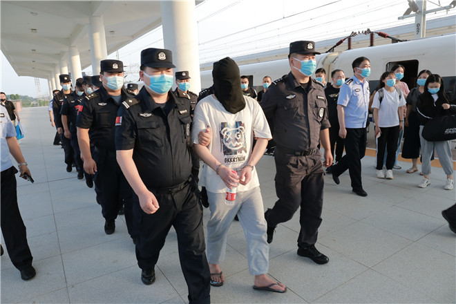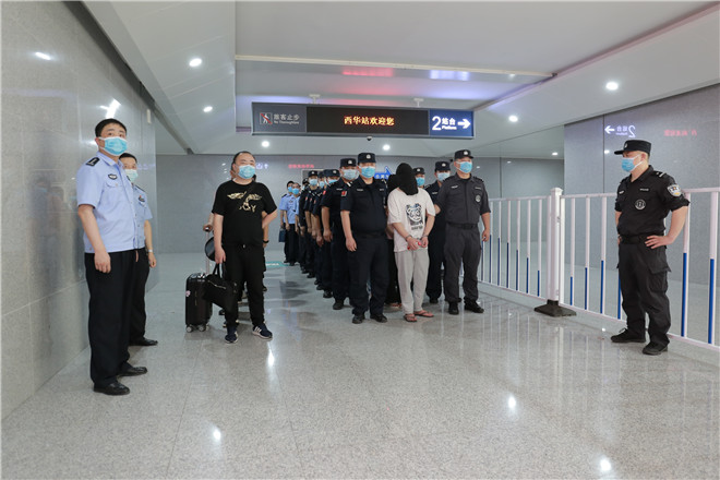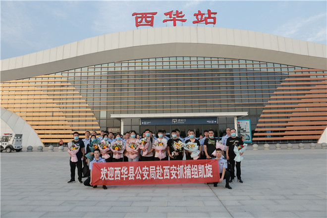 當(dāng)天,西華縣公安局在鄭阜高鐵西華站舉行歡迎儀式,迎接赴西安抓捕組凱旋歸來。特警在站臺上排列整齊、嚴(yán)陣以待,列車準(zhǔn)時??康秸?,7名犯罪嫌疑人隨即被押解下車,全副武裝的特警立即上前進行押解交接,押往在高鐵出站口等候的裝甲車上。至此,歷經(jīng)三天三夜,一起電信網(wǎng)絡(luò)詐騙團伙案成功告破。