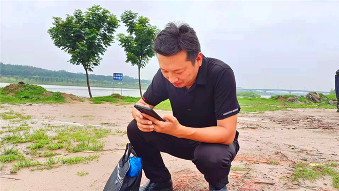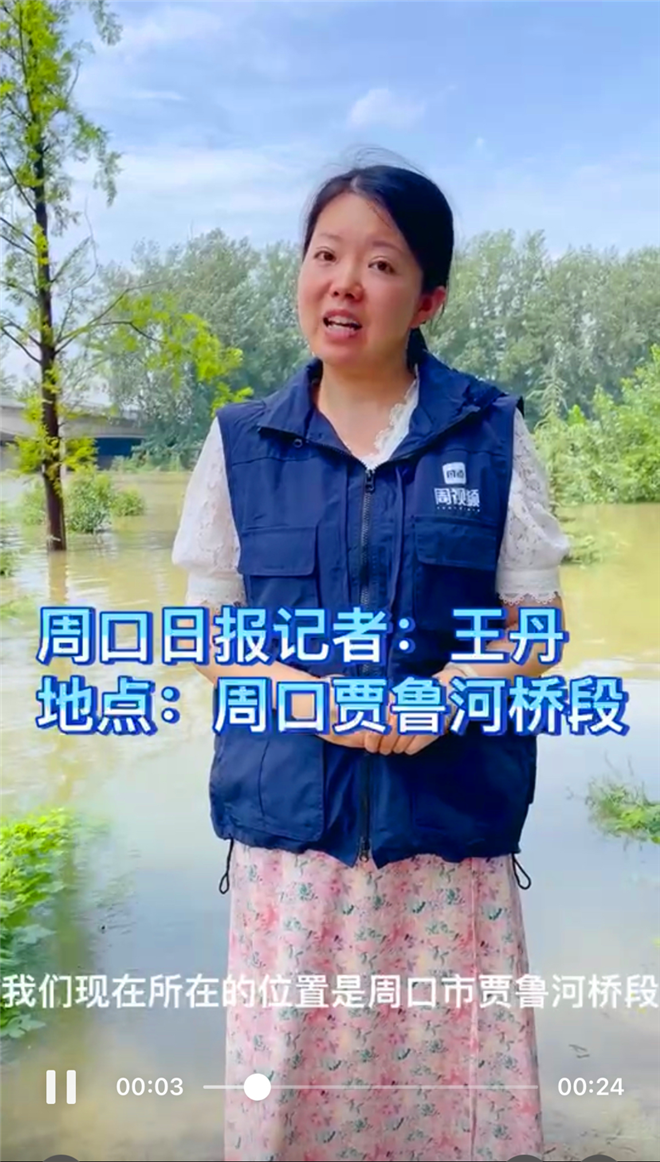記者王丹在周口市賈魯河橋段采訪