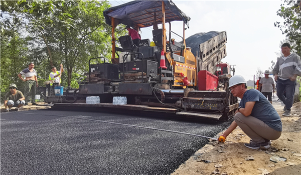 路面鋪油作業(yè)從淮陽(yáng)區(qū)葛店鄉(xiāng)與鄲城縣李樓鄉(xiāng)交界處開始,一臺(tái)攤鋪機(jī)鋪設(shè)寬度為7米,壓實(shí)厚度為5厘米,以平均每分鐘5米的速度前行,數(shù)輛運(yùn)料車輪流供料給攤鋪機(jī)。攤鋪機(jī)過后,兩臺(tái)壓路機(jī)交替運(yùn)行,立即把路面壓實(shí);兩臺(tái)灑水車配合作業(yè),路面一次成型,寬闊而平坦。