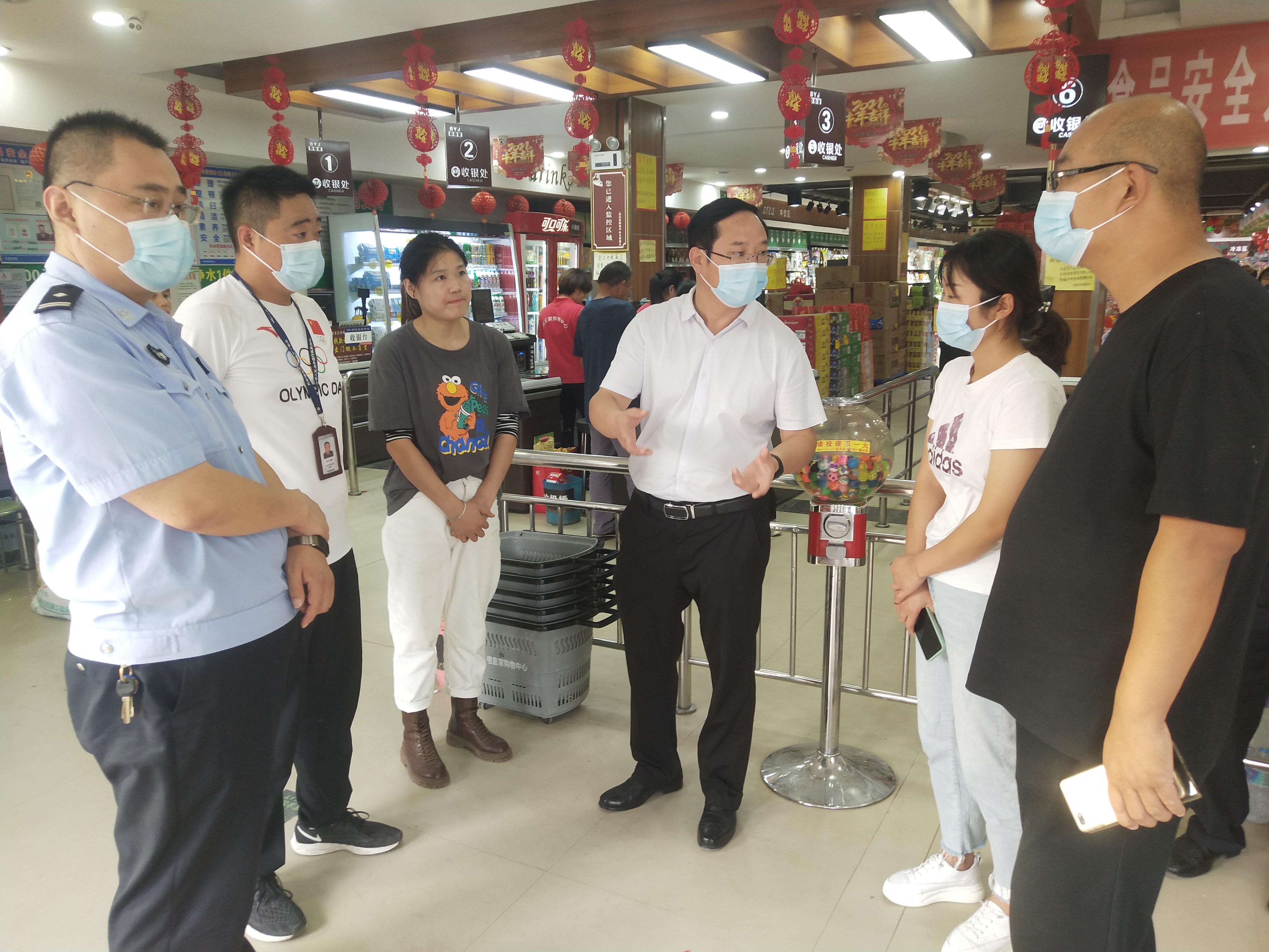 “你們這個超市經(jīng)營面積多少?配備多少消防栓、滅火器?有幾個逃生通道?員工是否熟知消防安全常識?油炸熟食肉類食品是如何保障質(zhì)量的……”“咱樓上樓下營業(yè)面積共2000平方米,配備20個消防栓、60個滅火器,有2個逃生通道,每周都對員工進行消防安全演練,每一批食品都有檢測報告……”10月1日下午,商水縣平店鄉(xiāng)黨委書記段文海、鄉(xiāng)長位望喜、主管安全生產(chǎn)的副鄉(xiāng)長劉春苗帶隊,組織鄉(xiāng)派出所、市場監(jiān)督所相關(guān)人員到安全生產(chǎn)重點場所“萬果園超市90號”連鎖店開展國慶節(jié)安全生產(chǎn)暗訪檢查,超市負責人呂四偉詳細介紹了安全經(jīng)營情況。