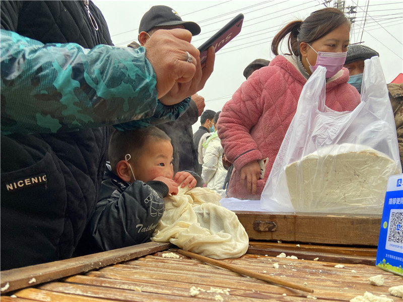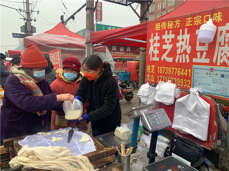 在固墻鎮(zhèn)的集市上,“桂枝熱豆腐”攤位前的顧客絡(luò)繹不絕?!敖o我來50塊錢的豆腐”“我要20斤,先給我切豆腐吧”“我要30斤,多少錢”……人群將豆腐攤里三層外三層圍了起來,從人群外朝里看看不見豆腐,只看到豆腐攤里冒出來的團(tuán)團(tuán)熱氣?!暗攘税雮€小時了,剛才那一盒豆腐沒輪到我就賣完了,這才搶到手?!备浇拇迕駰畲鬆斈弥鴦傎I的豆腐高興地說?!拔覐穆挂貋淼模憬阍诶锩鏀D著買豆腐,我在這兒等她呢?!?歲的張家瑞說,她每年放寒假都會和家人一起到固墻來探親,過年的時候逛逛集市,順便買些豆腐帶回鹿邑。