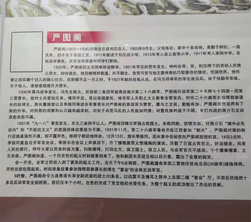 嚴(yán)圖閣出生于1903年,河南省沈丘縣人。1911年,嚴(yán)圖閣被父親送進(jìn)劉莊店小學(xué)讀書,1915年考入縣立高等小學(xué),1917年投考淮陽中學(xué)被錄取。他刻苦讀書,成績優(yōu)異,深得老師和同學(xué)們的贊揚(yáng)。1921年,他毅然背井離鄉(xiāng),外出從軍。1930年,嚴(yán)圖閣任國民革命軍第二十六路軍一團(tuán)三營營長。1931年12月,參加著名的寧都起義,成為中國共產(chǎn)黨領(lǐng)導(dǎo)的革命隊伍中的一員。寧都起義后,嚴(yán)圖閣所在部隊改編為紅軍第五軍團(tuán),由于其驍勇善戰(zhàn),累積戰(zhàn)功,被任命為第十六師參謀長。1932年,嚴(yán)圖閣正式加入中國共產(chǎn)黨。1935年在湖北一場戰(zhàn)斗中身負(fù)重傷,后轉(zhuǎn)移至湖南省平江縣治療。1936年3月,嚴(yán)圖閣奉命擔(dān)任湘鄂贛省軍區(qū)司令員職務(wù),進(jìn)行游擊戰(zhàn)爭,為保衛(wèi)湘鄂贛革命根據(jù)地作出了貢獻(xiàn)。1936年11月,嚴(yán)圖閣因病不幸去世。