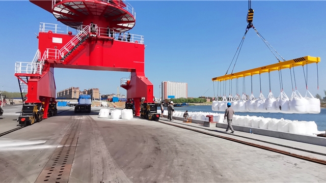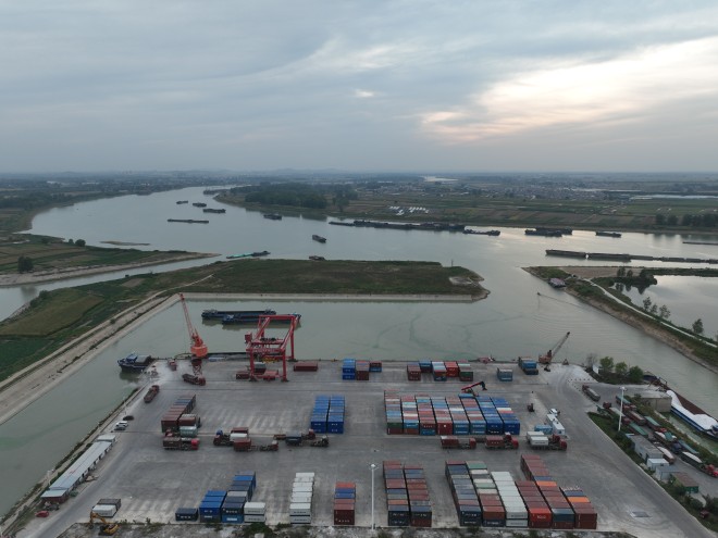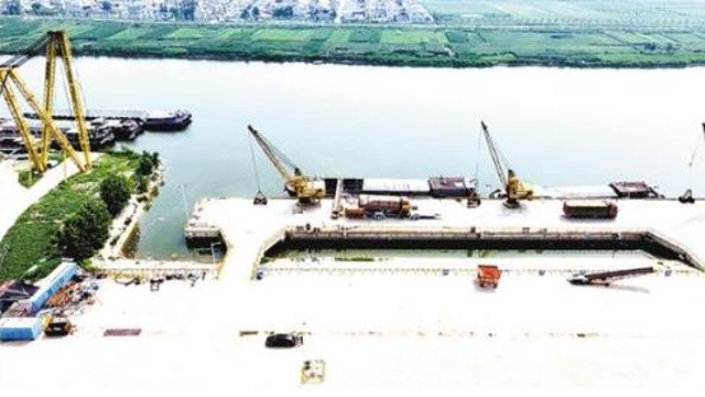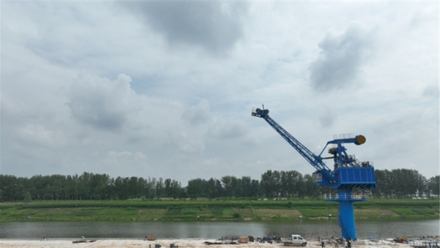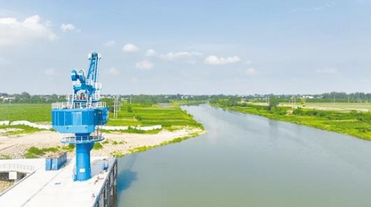 • 盛夏七月,在項城市東部的項城港,幾架“高聳入云”的新式固定式起重機(jī)的主體已安裝完畢,剩余的部件堆放在地上,巨大的框架和鮮紅的涂裝展示著它們的力量。一側(cè),千噸級貨輪正??吭陂L長的泊位前,起重機(jī)緩緩卸下貨艙內(nèi)的散貨。