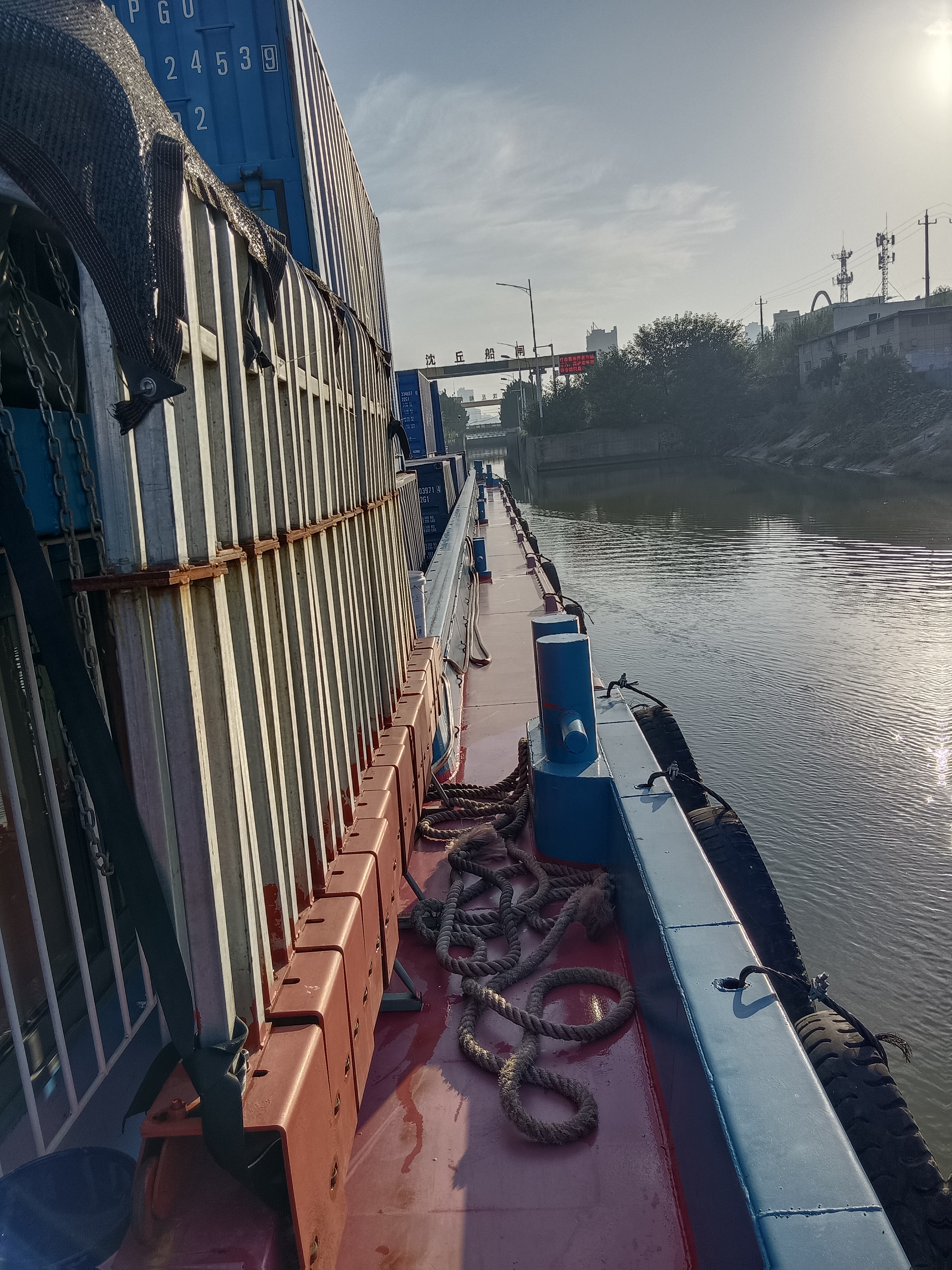 • 9月25日傍晚,船老大董海軍吊裝好了36個集裝箱,從項城港啟航了。他運送的貨物是純堿,生產(chǎn)玻璃的原材料,目的地是安徽鳳陽港。這次,記者一行從水路出發(fā),隨行采訪。