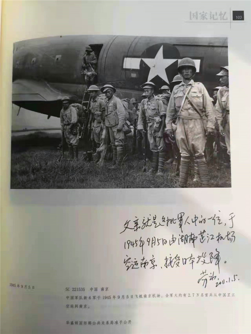 1945年3月,父親隨干訓(xùn)團(tuán)空運(yùn)回國,駐扎云南曲靖,繼續(xù)訓(xùn)練、待命。1945年8月15日,日本投降。干訓(xùn)團(tuán)全體官兵乘汽車到達(dá)湖南芷江機(jī)場(chǎng)(插圖5),再空運(yùn)到南京,參加南京日本受降儀式(插圖6) 。