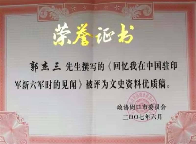 2005年9月3日,時(shí)任中共中央總書記、國家主席、中央軍委主席胡錦濤發(fā)表了《在紀(jì)念中國人民抗日戰(zhàn)爭(zhēng)暨世界反法西斯戰(zhàn)爭(zhēng)勝利60周年大會(huì)上的講話》,正視了正面戰(zhàn)場(chǎng)國民黨軍隊(duì)抗戰(zhàn)的歷史。之后,父親才給我講述他遠(yuǎn)征抗日的經(jīng)歷,并撰寫了《回憶我在中國駐印軍新六軍時(shí)的見聞》一稿,刊登在2007年《周口文史資料》上。政協(xié)為表彰父親的貢獻(xiàn),特別頒發(fā)了“文史資料優(yōu)質(zhì)稿”獎(jiǎng)狀。