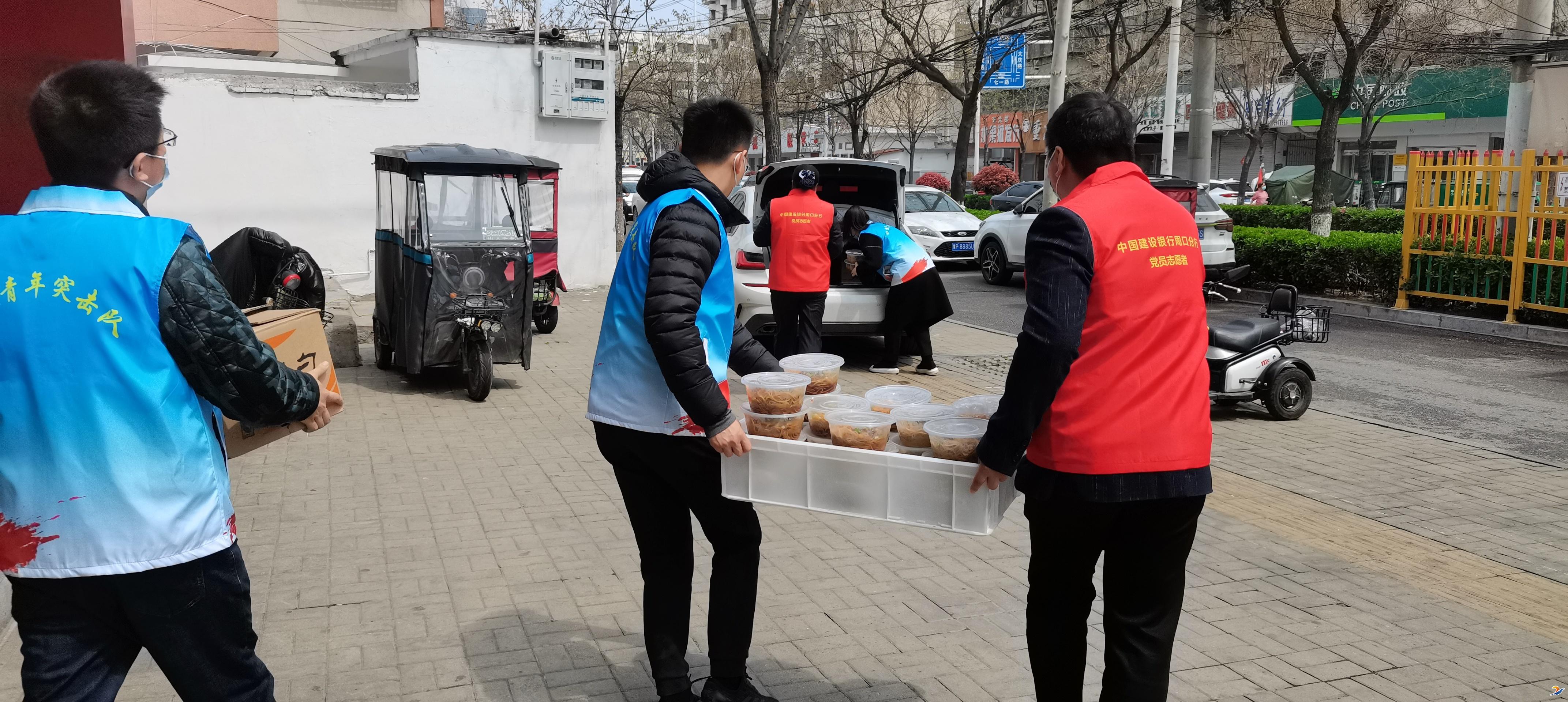4月1日中午,在市區(qū)孫記sa湯門店,建行周口分行豫建青年突擊隊的成員和黨員志愿者們正忙著把剛做好的蒸餃、香腸、熱干面等分裝打包,放進(jìn)保溫箱,然后統(tǒng)一送到疫情防控卡點(diǎn)。同時,為保證送餐安全,從做餐、送餐,整個流程都進(jìn)行了嚴(yán)格的檢測和消毒,確保一線抗疫人員吃到放心食物。