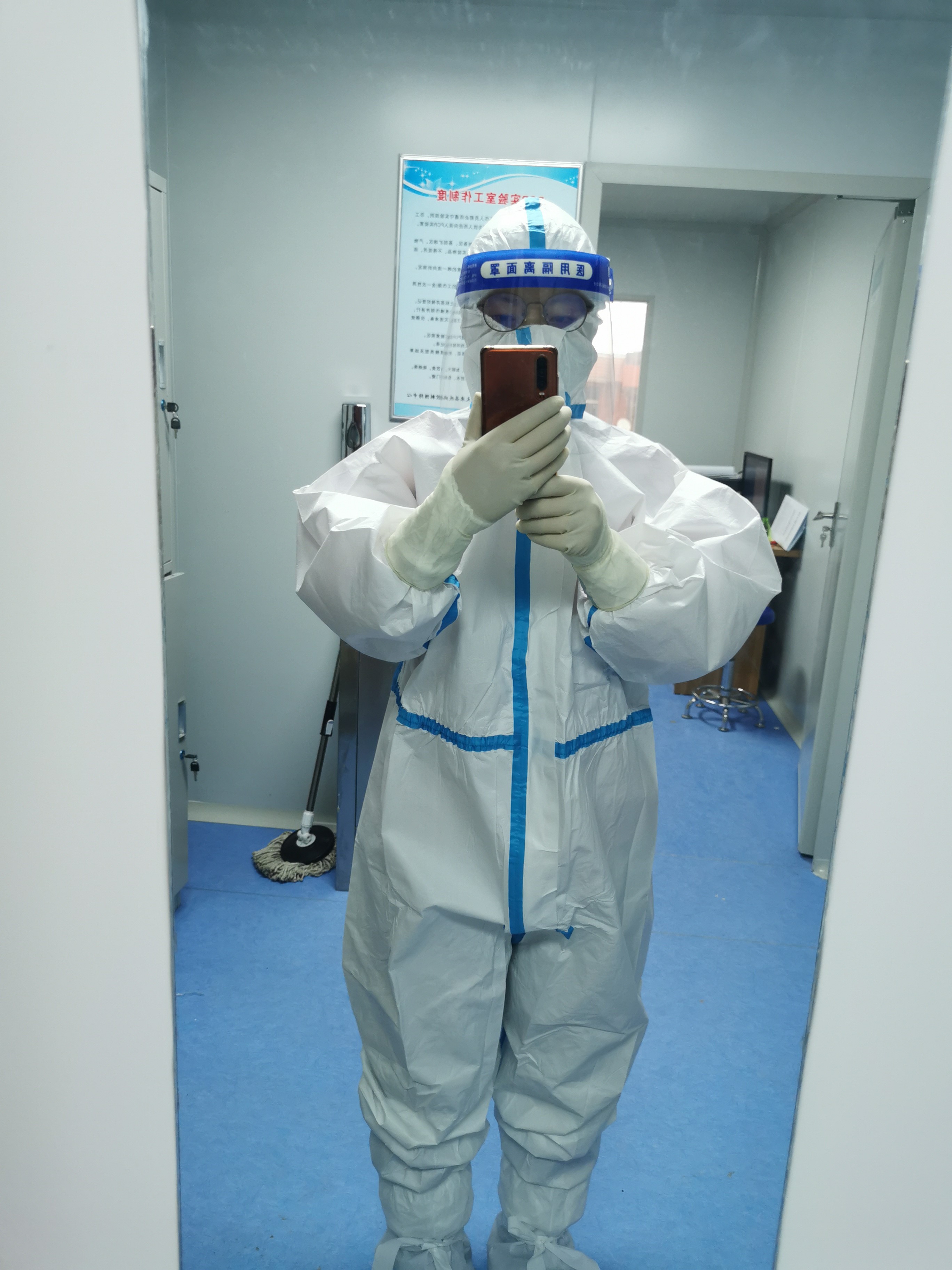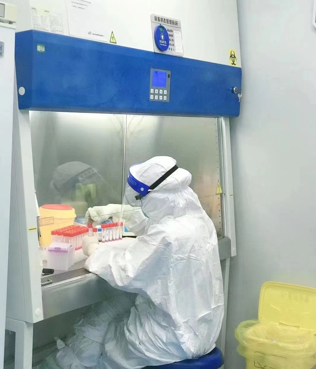 實(shí)驗(yàn)室的三級(jí)防護(hù)包括穿著連體防護(hù)服,戴N95口罩、雙層手套、鞋套和護(hù)目鏡。由于核酸檢測(cè)不同于其他檢測(cè),PCR 實(shí)驗(yàn)室里機(jī)器不間斷運(yùn)行,即使開(kāi)著空調(diào),室內(nèi)溫度也有27℃~28℃。密不透風(fēng)的防護(hù)裝備一穿就是6個(gè)小時(shí)~8個(gè)小時(shí),感染風(fēng)險(xiǎn)大、操作過(guò)程長(zhǎng),每次結(jié)束工作,姜等等渾身都會(huì)被汗水浸透。核酸提取、體系配制、擴(kuò)增檢測(cè)……每道程序背后,都充滿了高風(fēng)險(xiǎn)。接收的樣本有鼻咽拭子,鼻咽拭子直接震蕩混勻處理,取一定量到核酸提取板,提取完成,加一定量提取液到透明的八聯(lián)管內(nèi),每一步都要做到無(wú)一缺漏。