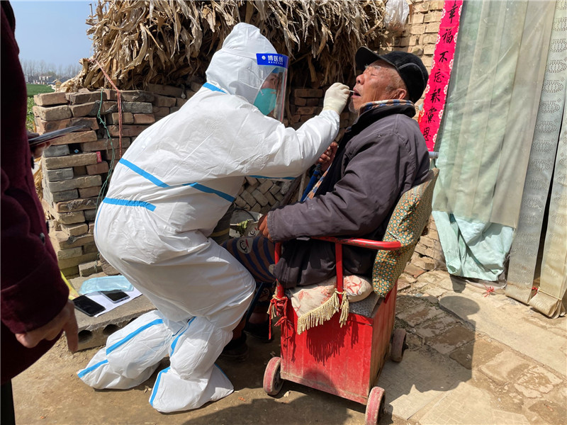 3月23日至4月13日,喬晶每天凌晨出發(fā),穿著密閉的防護(hù)服連續(xù)22天在太康馬廠工作。4月2日起,所有行政村實(shí)行入戶采集。從全民采樣到入戶采樣、封控人員實(shí)行一戶一管、重點(diǎn)管控人員一人一管、二十人混管到單管,加之村莊大、人員居住分散等,喬晶和她的同事面臨的是巨大挑戰(zhàn)!援太期間,每天都是30多攝氏度的高溫天氣,喬晶穿著密不透風(fēng)的防護(hù)服,戴著防護(hù)帽、防護(hù)面屏、口罩、手套,幾分鐘便汗如雨下。對(duì)此,她無(wú)怨無(wú)悔。