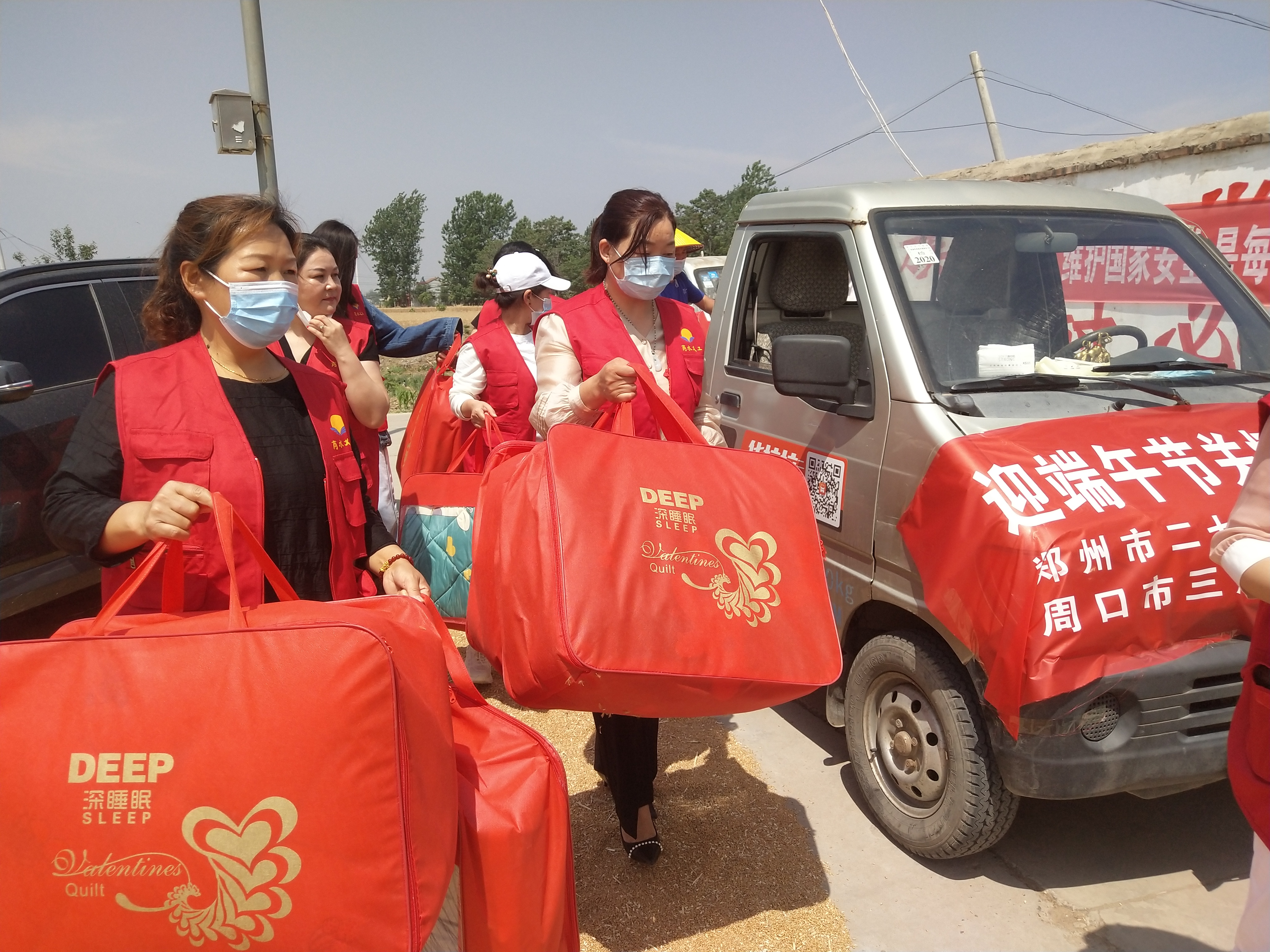 一輛滿載“高級夏涼被”的小型貨車,從周口出發(fā),經(jīng)商水城區(qū),徑直駛向該村村室。9名身穿紅馬甲的愛心志愿者麻利地卸下物品,為在這里等候的15位孤寡困難老人送上了一份暖心的端午節(jié)禮物。