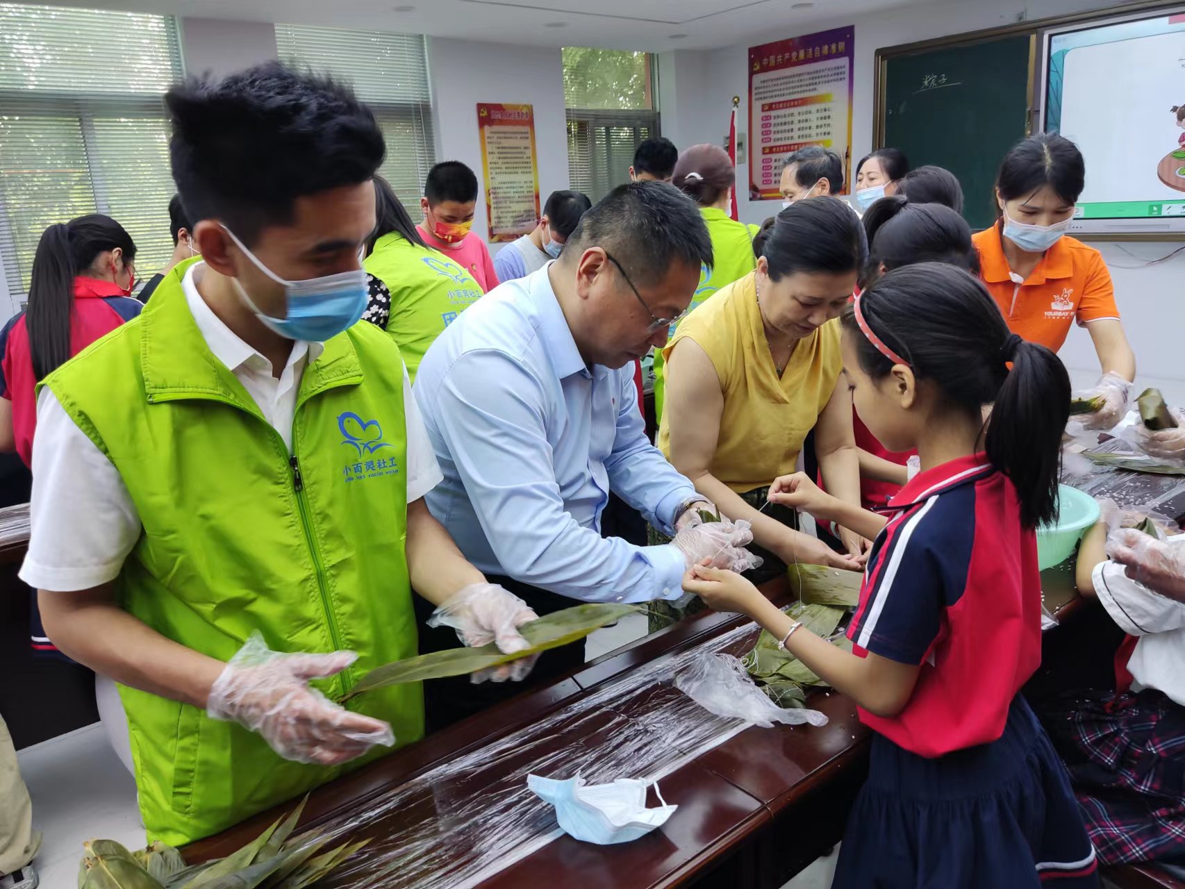 活動(dòng)中,文昌小學(xué)教師通過(guò)PPT、游戲等形式,向孩子講解端午節(jié)的來(lái)歷、習(xí)俗及有關(guān)端午節(jié)的故事,引導(dǎo)孩子弘揚(yáng)中國(guó)傳統(tǒng)文化。文昌小學(xué)社工站志愿者給孩子表演了影子劇《最愛的,是我》。周口師范學(xué)院工作人員向同學(xué)們講解了包粽子的方法。在社工的指導(dǎo)下,一雙雙忙碌的小手穿梭在一張張翠綠的粽葉間。社工們還為每位孩子準(zhǔn)備了粽子禮包,讓他們帶回家給爺爺奶奶嘗一嘗。