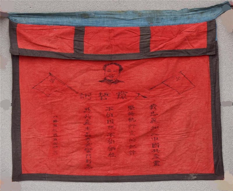 在德高民俗博物館,陳列著這樣一面旗幟,旗身長(zhǎng)約90厘米,寬約70厘米,旗幟上印有毛澤東同志頭像及入黨誓詞文字,旗幟左下方印有“八路軍抗戰(zhàn)指揮部制”落款文字,該入黨誓詞旗幟為抗日戰(zhàn)爭(zhēng)時(shí)期制作完成。凝視這面旗幟,對(duì)革命先烈的欽佩感油然而生。