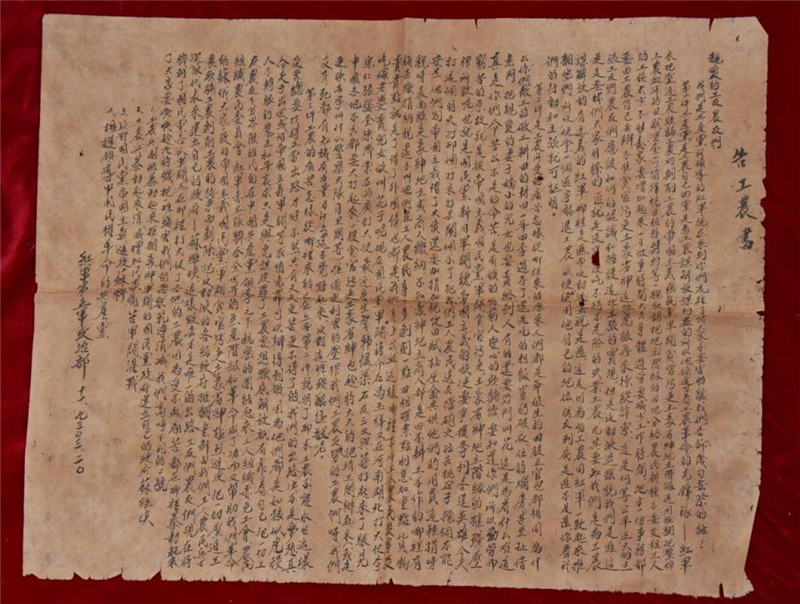 1928年7月22日,彭德懷領(lǐng)導(dǎo)湘軍獨(dú)立第五師第一團(tuán)等部于湖南省平江城起義。不久,部隊(duì)即奉命改編為中國(guó)工農(nóng)紅軍第五軍第十三師。1930年6月,紅五軍在湖北省大冶縣編入紅三軍團(tuán)。根據(jù)《紅軍第五軍政治部告工農(nóng)書(shū)》的落款時(shí)間及內(nèi)容可以看出,此布告落款時(shí)間為1930年3月20日,它是研究紅五軍開(kāi)展農(nóng)民工作、宣傳工作和紅五軍光輝歷史的重要史料佐證。