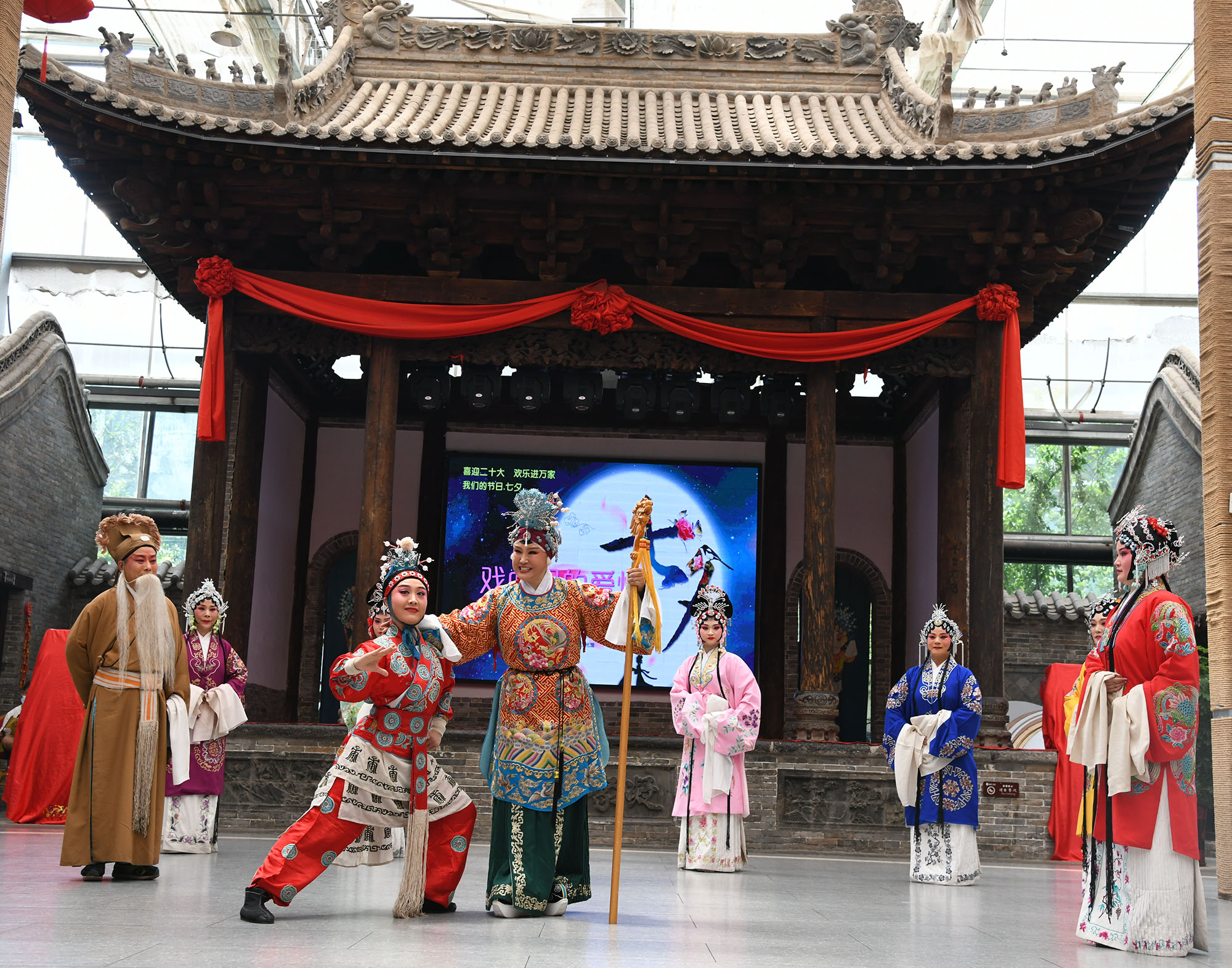 ?8月3日上午,市豫劇團(tuán)團(tuán)長、戲劇藝術(shù)家肖秀蓮帶領(lǐng)演員們在建業(yè)大食堂演出《五世請纓》中的《一家人歡天喜地》一折。