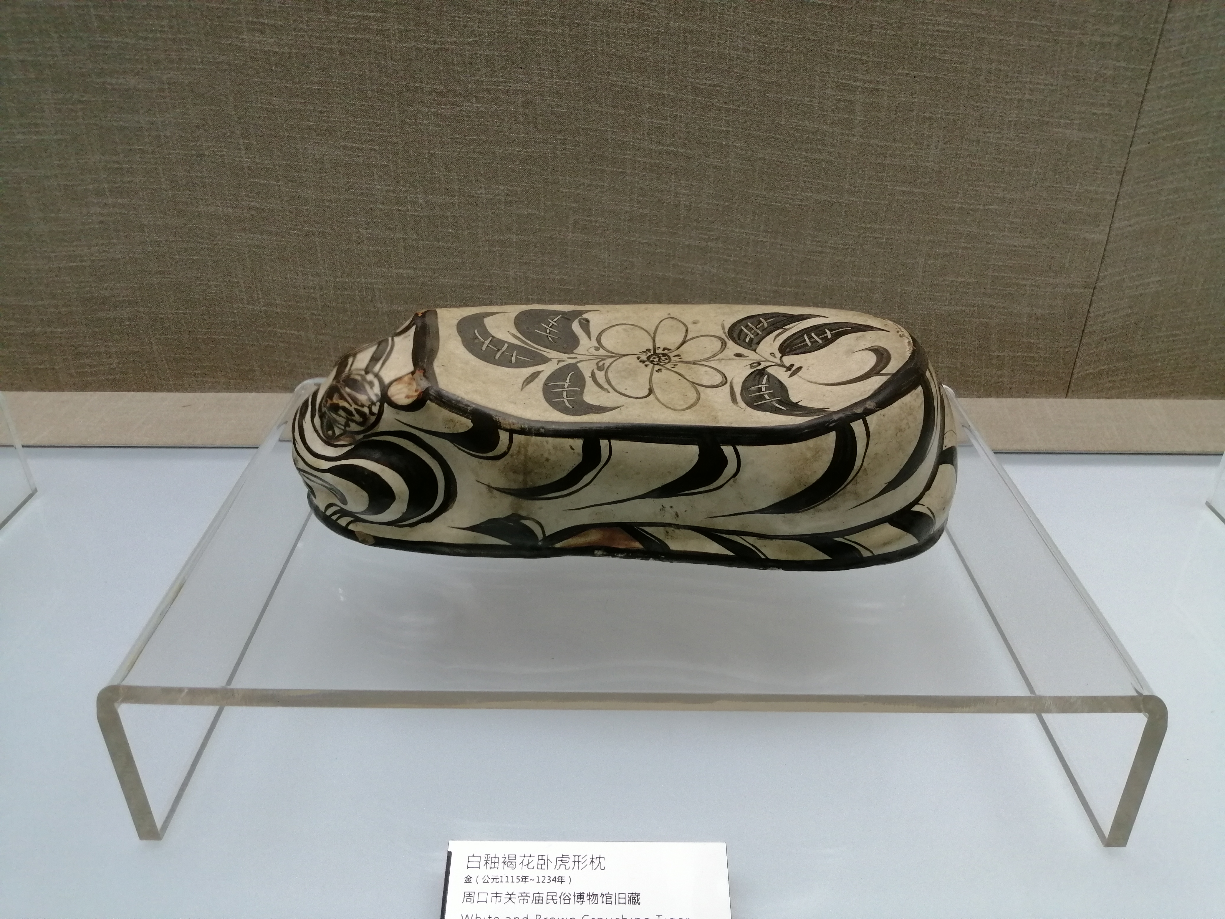 據(jù)市博物館工作人員介紹,這件館藏金代磁州窯白釉褐花臥虎枕是1978年7月商水縣練集鄉(xiāng)農(nóng)民在翻土?xí)r發(fā)現(xiàn)的。長(zhǎng)34厘米,寬14厘米,高10厘米。枕體呈臥虎狀,枕面為腰圓形,前高后低,大平底。整器以虎身為枕身,以黑彩繪出虎頭形象和虎身?xiàng)l狀斑紋,虎鼻為兩氣孔。以虎背作枕面,其上以黑彩繪折枝花卉,枝葉上飾“豐”字紋葉脈,花朵勾勒流暢,花蕊清晰可見。此枕將虎的溫馴的狀態(tài)及折枝花卉和諧地組合在一起,形象生動(dòng)活潑,情趣盎然,體現(xiàn)了工匠豐富的想象力。據(jù)說枕以虎等猛獸為造型,可鎮(zhèn)妖避邪、早得貴子。