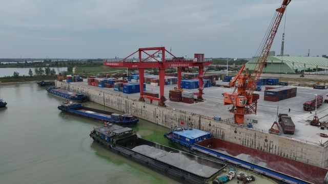 采訪組一行看到,三個巨大的港池錯落有致、分布在淮河右岸,一邊,起重機正為泊位上的貨輪裝卸純堿噸包、石英砂等貨物;另一邊,一排排集裝箱在岸邊碼放得井井有條,高聳的40噸級吊機將集裝箱裝載至來自周口的“潁河之星”貨輪上。隨后,貨輪伴著引擎的轟鳴聲駛入繁忙的淮河主航道,向淮安駛去。