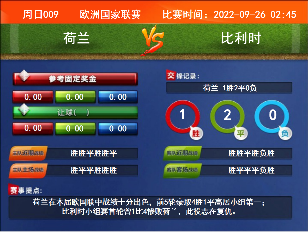 比賽時間:2022-09-26 02:45賽事提點:荷蘭在本屆歐國聯(lián)中戰(zhàn)績十分出色,前5輪豪取4勝1平高居小組第一;比利時小組賽首輪曾1比4慘敗荷蘭,此役志在復仇。