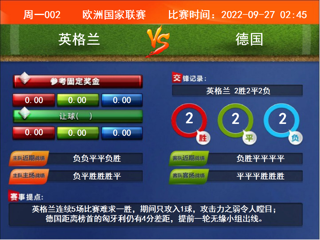 比賽時(shí)間:2022-09-27 02:45賽事提點(diǎn):英格蘭連續(xù)5場比賽難求一勝,期間只攻入1球,攻擊力之弱令人瞠目;德國距離榜首的匈牙利仍有4分差距,提前一輪無緣小組出線。