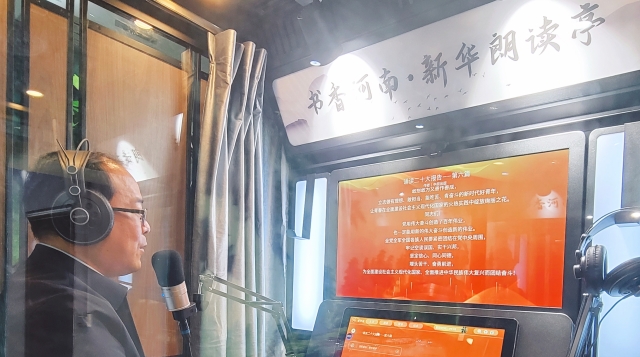 11月3日,在位于項(xiàng)城市商城路與西大街交叉口的新華書(shū)店朗讀亭內(nèi),誦讀愛(ài)好者年秋燕正在選讀黨的二十大報(bào)告原文,其深情且鏗鏘有力的誦讀聲令人如癡如醉。