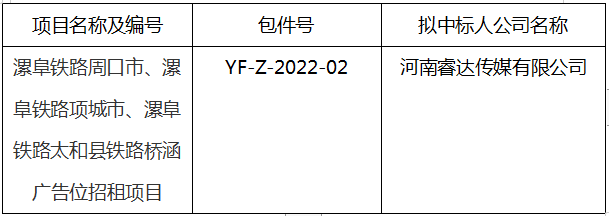 漯阜鐵路周口市、漯阜鐵路項城市、漯阜鐵路太和縣鐵路橋涵廣告位招租項目評標(biāo)結(jié)果公示