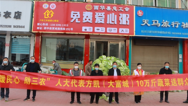 • “中國好人”、周口市人大代表方凱幫助黃橋鄉(xiāng)菜農(nóng)解決蔬菜滯銷難題,并通過西華縣紅十字會向這些單位捐贈10萬斤蔬菜,讓滯銷菜變“暖心菜”。方凱的這一舉動,受到群眾的稱贊。