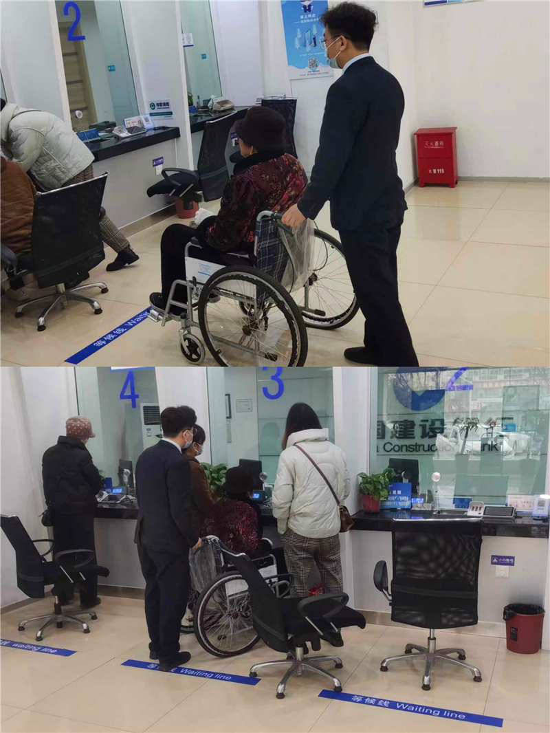 3月27日上午11點左右,項城蓮花大道支行大堂經(jīng)理張云磊在門口引導客戶時,發(fā)現(xiàn)兩位客戶扶著另一位客戶走進網(wǎng)點。注意到客戶雙腿行走不便,他立即推來輪椅,把客戶扶到輪椅上。三位客戶不熟悉銀行辦業(yè)務流程,大堂經(jīng)理張云磊全程跟隨指導辦理業(yè)務。經(jīng)詢問,大堂經(jīng)理得知客戶前來辦理社??せ顦I(yè)務,以便領取殘疾人補貼。大堂經(jīng)理立即幫他安排綠色通道,幫助家屬推輪椅到柜臺辦理,在一旁指導客戶填單跟簽名。