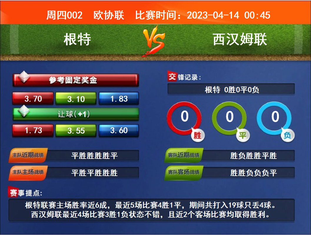 比賽時(shí)間:2023-04-14 00:45賽事提點(diǎn):根特聯(lián)賽主場(chǎng)勝率近6成,最近5場(chǎng)比賽4勝1平,期間共打入19球只丟4球。西漢姆聯(lián)最近4場(chǎng)比賽3勝1負(fù)狀態(tài)不錯(cuò),且近2個(gè)客場(chǎng)比賽均取得勝利。