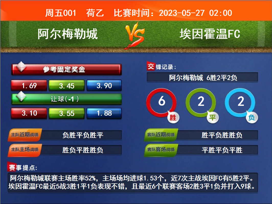 比賽時間:2023-05-27 02:00賽事提點:阿爾梅勒城聯(lián)賽主場勝率52%,主場場均進球1.53個,近7次主戰(zhàn)埃因FC有5勝2平。埃因霍溫FC最近5戰(zhàn)3勝1平1負表現(xiàn)不錯,且最近6個聯(lián)賽客場2勝3平1負并打入9球。