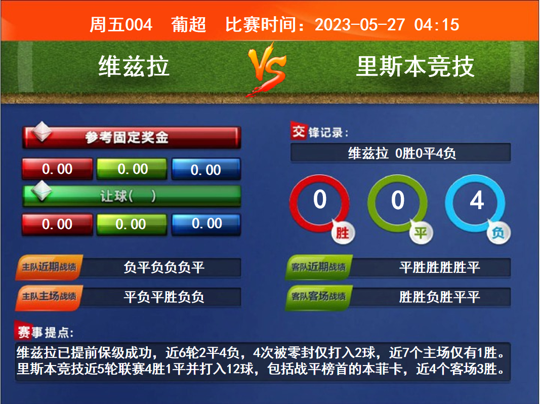 比賽時間:2023-05-27 04:15賽事提點:維茲拉已提前保級成功,近6輪2平4負,4次被零封僅打入2球,近7個主場僅有1勝。里斯本競技近5輪聯(lián)賽4勝1平并打入12球,包括戰(zhàn)平榜首的本菲卡,近4個客場3勝