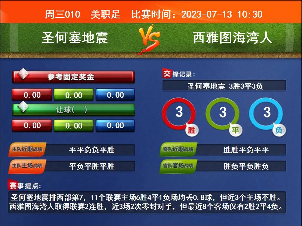 比賽時間:2023-07-13 10:30賽事提點:圣何塞地震排西部第7,11個聯(lián)賽主場6勝4平1負場均丟0.8球,但近3個主場不勝。西雅圖海灣人取得聯(lián)賽2連勝,近3場2次零封對手,但最近8個客場僅有2勝2平4負。