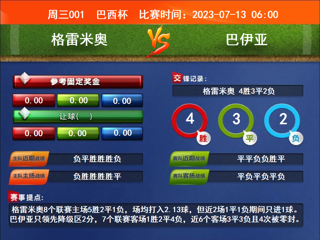 比賽時間:2023-07-13 06:00賽事提點:格雷米奧8個聯(lián)賽主場5勝2平1負,場均打入2.13球,但近2場1平1負期間只進1球。巴伊亞只領先降級區(qū)2分,7個聯(lián)賽客場1勝2平4負,近6個客場3平3負且4次被零封。