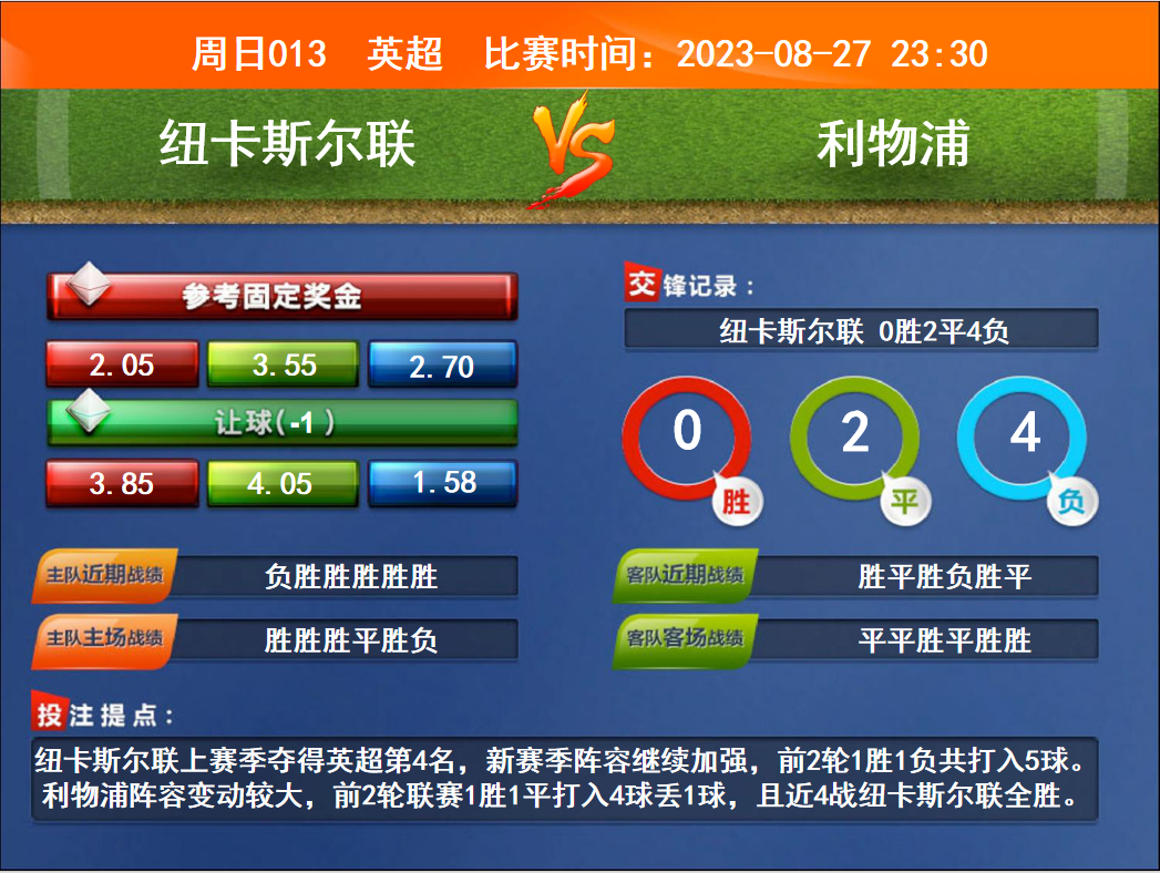 比賽時間:2023-08-27 23:30賽事提點:紐卡斯爾聯(lián)上賽季奪得英超第4名,新賽季陣容繼續(xù)加強,前2輪1勝1負共打入5球。利物浦陣容變動較大,前2輪聯(lián)賽1勝1平打入4球丟1球,且近4戰(zhàn)紐卡斯爾聯(lián)全勝。