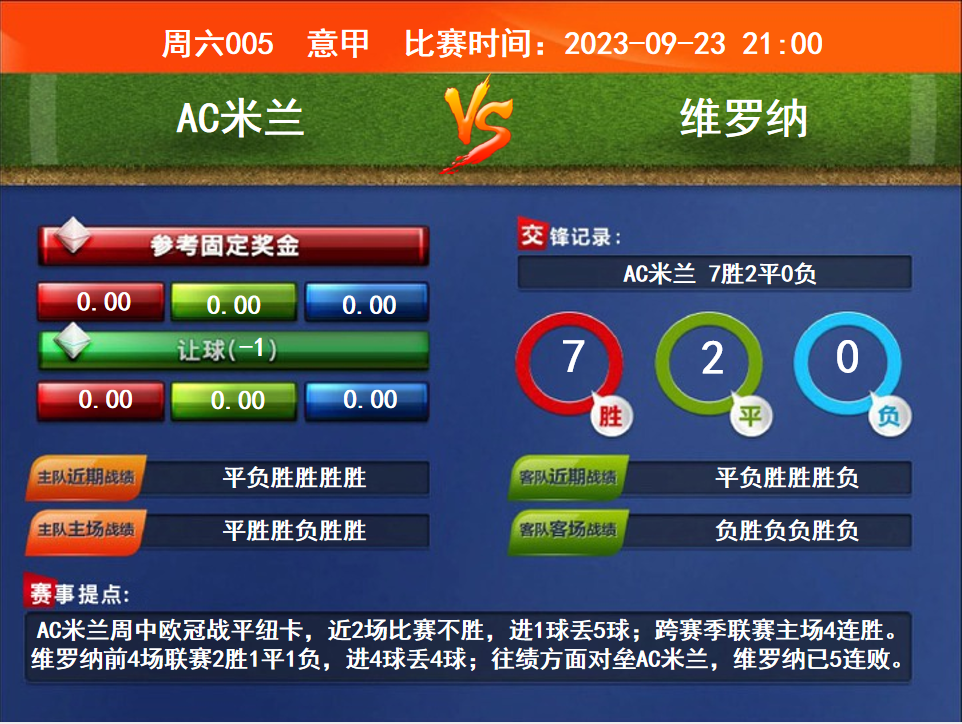 比賽時間:2023-09-23 21:00賽事提點:AC米蘭周中歐冠戰(zhàn)平紐卡,近2場比賽不勝,進1球丟5球;跨賽季聯(lián)賽主場4連勝。維羅納前4場聯(lián)賽2勝1平1負,進4球丟4球;往績方面對壘AC米蘭,維羅納已5連敗。