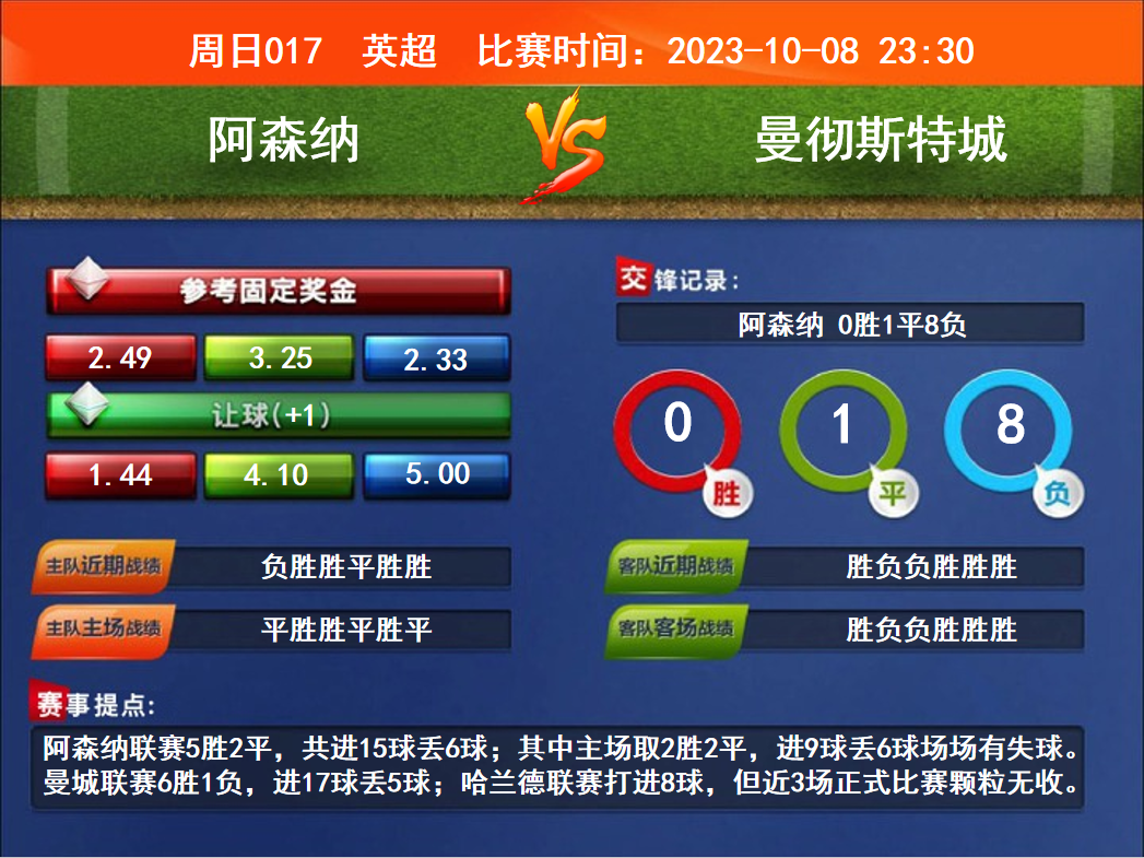 比賽時間:2023-10-08 23:30賽事提點:阿森納聯(lián)賽5勝2平,共進15球丟6球;其中主場取2勝2平,進9球丟6球場場有失球。曼城聯(lián)賽6勝1負,進17球丟5球;哈蘭德聯(lián)賽打進8球,但近3場正式比賽顆粒無收。