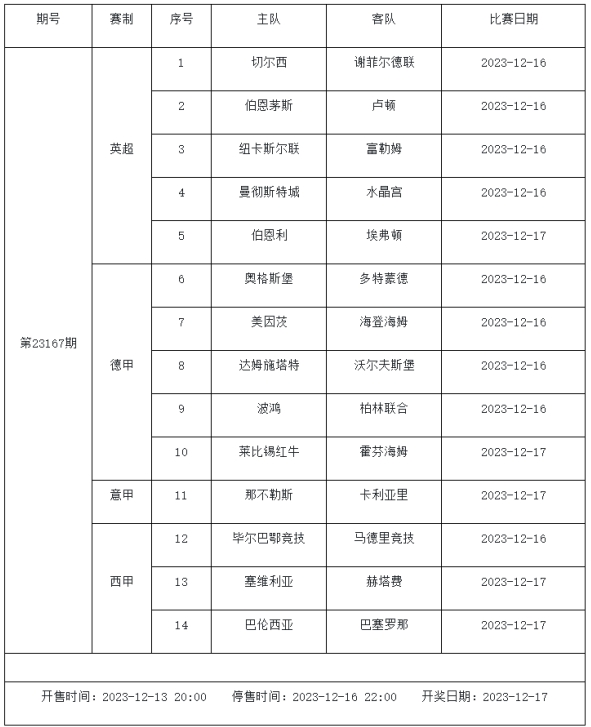 足球彩票勝負游戲(14場和任選9場)第23167期賽程: