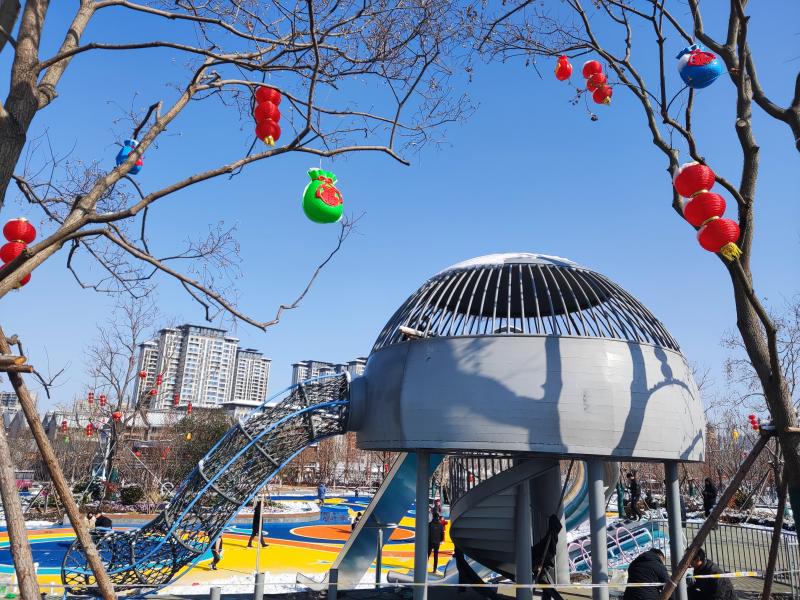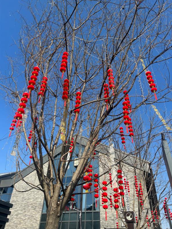 1月23日,記者在施工現(xiàn)場(chǎng)看到,施工人員正緊鑼密鼓進(jìn)行最后的掃尾工作。道路兩旁樹(shù)枝上掛滿(mǎn)了象征吉祥如意的紅燈籠、中國(guó)結(jié)、春字燈飾。
