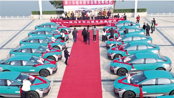 12月19日上午,周口和諧廣場舉行純電動(dòng)出租車交付儀式,一百輛全新純電動(dòng)轎車正式交付扶溝出租車公司并投入運(yùn)營。