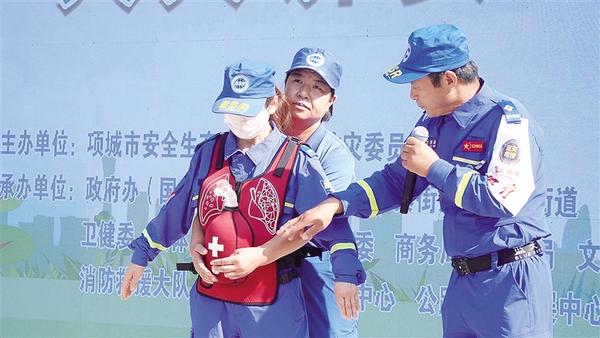 6月16日,項城市舉行“安全宣傳咨詢?nèi)铡被顒??;顒釉O置警示教育片展播、應急技能演示、救援裝備展示、安全咨詢等環(huán)節(jié)。圖為項城應急藍天救援隊3名隊員演示海姆立克急救法操作流程。