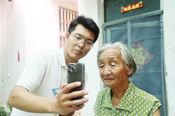 在淮陽區(qū)王店街道祝寨村,返鄉(xiāng)大學(xué)生周宏領(lǐng)為老人完善身份信息。近日,淮陽區(qū)開展80歲以上老人津貼系統(tǒng)信息更新工作,為確保政策精準(zhǔn)落實(shí),老人需提供最新身份信息。