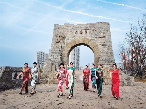 1月14日,身著各色旗袍的模特冒著嚴(yán)寒在南寨歷史文化街區(qū)普濟門前進行模特走秀表演,為冬日的城區(qū)增添了一抹亮麗色彩。