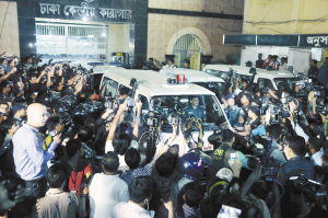孟加拉國反對黨領(lǐng)導(dǎo)人被執(zhí)行死刑 4月11日,在孟加拉國首都達(dá)卡,人們圍住運(yùn)送卡馬魯扎曼尸體的救護(hù)車。當(dāng)晚,孟加拉國反對黨伊斯蘭大會(huì)黨領(lǐng)導(dǎo)人卡馬魯扎曼在首都達(dá)卡中央監(jiān)獄被執(zhí)行死刑。新華社發(fā)