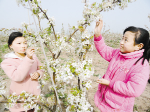 4月12日,商水縣舒莊鄉(xiāng)北王張村的小學(xué)生在自家的梨園為梨花授粉。星期天,該村的小學(xué)生紛紛跑到梨園欣賞盛開的梨花,幫助家長為梨花授粉,享受著在梨花中勞動(dòng)的樂趣。