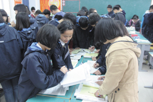 該校將課堂名字定為“求真大課堂”,以“真”字作為學(xué)校一切教育教學(xué)和管理的衡量標(biāo)準(zhǔn)。朱貴華說(shuō),求真就是要真教、真學(xué)、真嚴(yán)、真愛(ài)、真實(shí)、真會(huì)。為提高課堂教學(xué)效果,該??偨Y(jié)出一套獨(dú)特的課堂教學(xué)方法——“七音和鳴”。分管教學(xué)工作的副校長(zhǎng)徐其運(yùn)用“1234567”,即哆來(lái)咪發(fā)唆拉西”來(lái)詮釋“七音和鳴”法?!?”就是一個(gè)學(xué)習(xí)目標(biāo);“2”就是提前兩分鐘進(jìn)班,布置2個(gè)任務(wù)(出示目標(biāo)、檢查學(xué)情);“3”就是準(zhǔn)備3個(gè)本子,即學(xué)情檢效本、跟蹤本、糾錯(cuò)本;“4”是4個(gè)維度考評(píng),即高速度、準(zhǔn)確度、干凈度、參與度;“5”是5個(gè)跟蹤,即節(jié)跟蹤、日跟蹤、周跟蹤、月跟蹤、學(xué)期跟蹤,堅(jiān)持“抓緊跟蹤不放松、我在文昌必成功”的教育信念;“6”是6個(gè)環(huán)節(jié),即激情導(dǎo)入、自研自探、合作探究、展示質(zhì)疑、師生點(diǎn)評(píng)、當(dāng)堂檢測(cè);“7”是7個(gè)評(píng)價(jià),即教師的教案、學(xué)生的學(xué)案、練案、觀課記錄的每周業(yè)務(wù)評(píng)價(jià)及對(duì)學(xué)生的即時(shí)性、激勵(lì)性、長(zhǎng)效性評(píng)價(jià)。