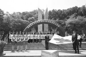 5月5日,大學(xué)生們在抗日航空烈士紀(jì)念碑前合影。
