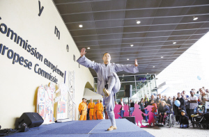“中國角”首次現(xiàn)身歐盟開放日      5月9日,在比利時首都布魯塞爾歐盟委員會大樓下,中國武僧表演功夫。當(dāng)日是歐盟一年一度的開放日。因今年恰逢中歐建交40周年,中國成為歐盟成員國外唯一一個開設(shè)宣傳角的國家,也是1993年歐盟舉辦開放日以來中國首次參加,為今年的開放日增添了不少中國元素。新華社發(fā)