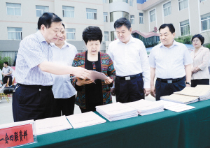 圖為蔣美蘭在徐光等市領(lǐng)導(dǎo)陪同下,察看太康縣信訪“一會四聯(lián)”資料。(記者 王映 攝)