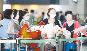 韓國(guó)又確診中東呼吸綜合征患者      5月30日,在韓國(guó)仁川國(guó)際機(jī)場(chǎng),佩戴口罩的乘客排隊(duì)等候辦理登機(jī)手續(xù)。韓國(guó)保健福祉部30日例行通報(bào)說(shuō),當(dāng)日新確診了1例中東呼吸綜合征患者。至此,韓國(guó)國(guó)內(nèi)確診的患者已增至12人,另有一名韓國(guó)患者在中國(guó)被確診。新華社發(fā)
