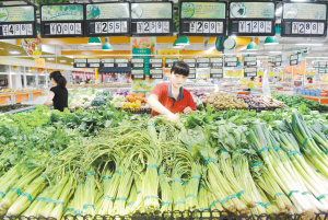 6月9日,一名工作人員正在市區(qū)一超市內(nèi)擺放蔬菜。當日,國家統(tǒng)計局發(fā)布的數(shù)據(jù)顯示,2015年5月,全國居民消費價格總水平同比上漲1.2%。(牟宇 攝)