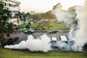 6月22日,在馬來(lái)西亞雪蘭莪州加影的一所學(xué)校,一名工作人員在噴滅蚊煙霧。根據(jù)馬來(lái)西亞衛(wèi)生部當(dāng)日的資料,今年1月至6月11日間,馬來(lái)西亞共有50873例登革熱病例,其中144名死亡,死亡率比去年同期增加百分之百。